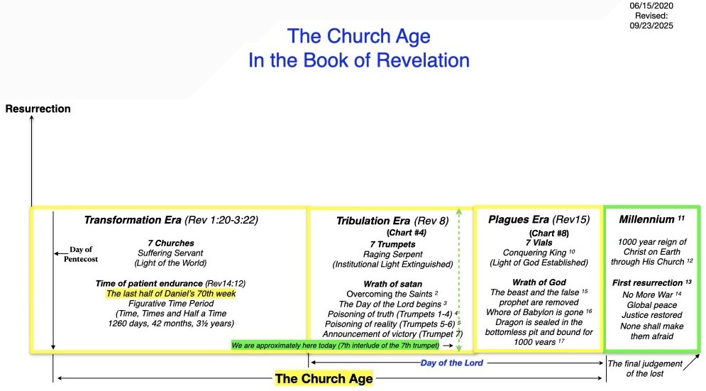 The fifth interlude is describing the Second Coming of Christ. It does not happen during the tribulation; either pre-trib, mid-trib, or post-trib. It doesn’t happen at the end of the tribulation. It is the consummating event that happens at the end of the seven plagues of God’s wrath, when the 7th vial is poured out on satan’s kingdom. If the Church understood this, it would end most of the controversy about the tribulation that has been so distracting to us.
